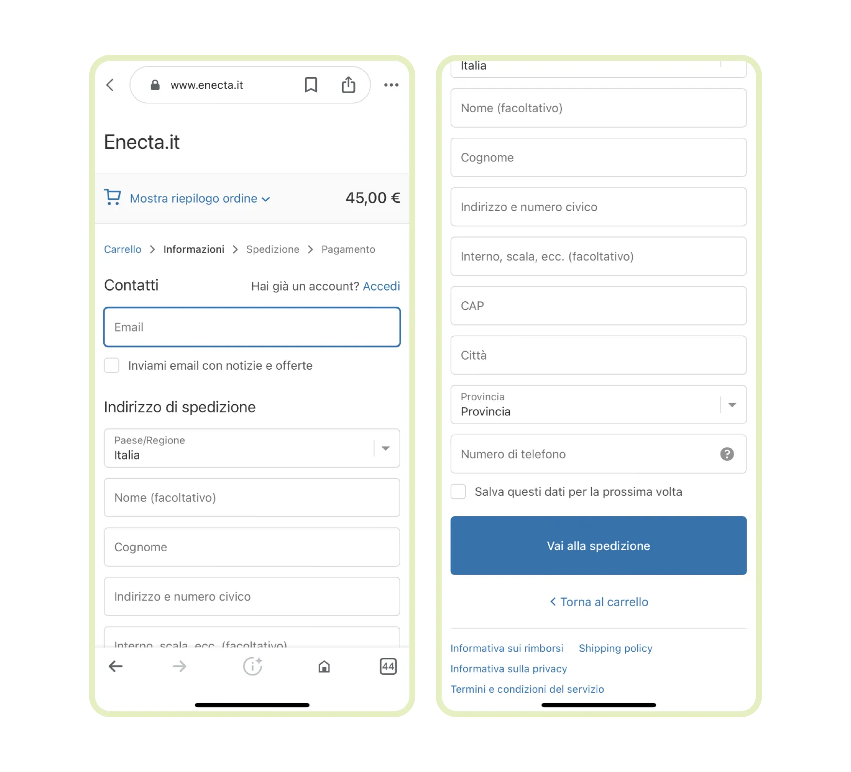 Se stai navigando da mobile avrai invece il form per l’inserimento dei dati a tutta pagina, con la possibilità di aprire la tab con riepilogo dell’ordine in alto e il link per tornare al carrello in fondo alla pagina