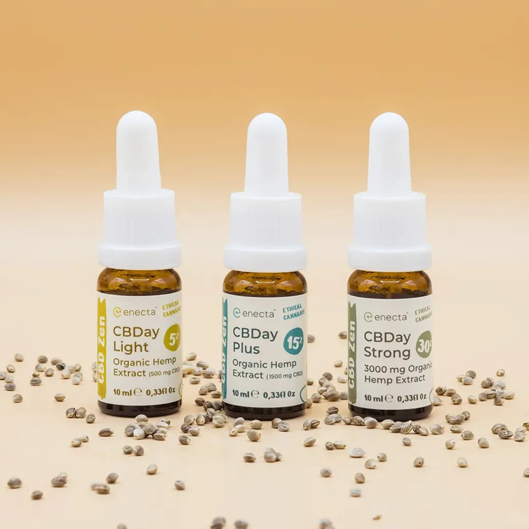 La linea oli CBDay Enecta, ottenuta da una genetica di canapa che abbiamo sviluppato appositamente per la produzione di estratti, è disponibile in concentrazioni al 5%, al 15% e al 30%.