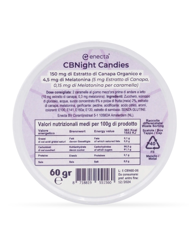 Le caramelle per dormire CBNight, con estratto di canapa e melatonina sono pensate per sostenere il tuo ritmo circadiano e aiutarti in caso di insonnia, risvegli notturni o difficoltà ad addormentarti . Agiscono in modo naturale ma efficace, favorendo un sonno continuo e riposante. La melatonina contribuisce a regolare il ciclo sonno-veglia, aiutando l’organismo a riconoscere il momento giusto per rilassarsi e addormentarsi. L’estratto di canapa favorisce uno stato di calma e quiete, utile per allentare le tensioni della giornata. Insieme, sostengono un sonno più naturale, continuo e rigenerante.