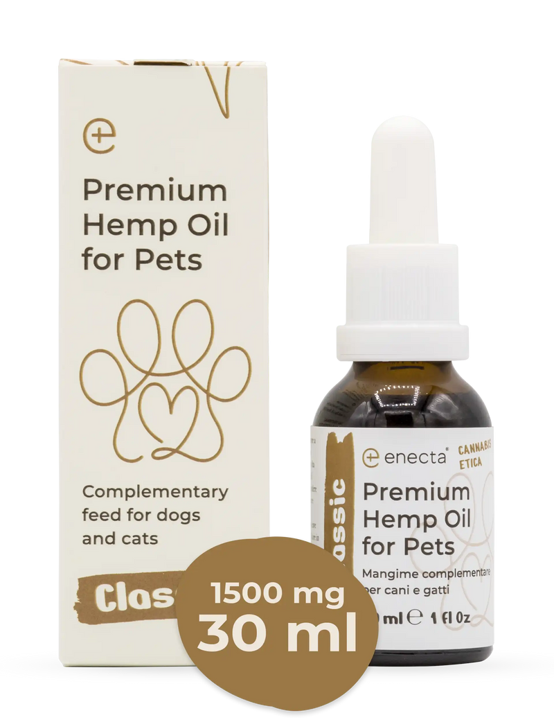 Premium Hemp Oil per animali Enecta è un mangime complementare a base di olio di canapa con acidi grassi Omega 3, Omega 6 e Vitamina E studiato per supportare il benessere quotidiano dei cani. Contribuisce a mantenere la cute sana, preserva la luminosità del pelo e favorisce il benessere generale con componenti ad azione antiossidante, utili a sostenere le normali funzioni dell’organismo. È adatto a cani di tutte le razze ed età ed è facile da somministrare grazie al comodo contagocce. Viene realizzato con Enectaliana®, la nostra varietà di canapa certificata, sviluppata per garantire elevati standard di qualità e sicurezza.”